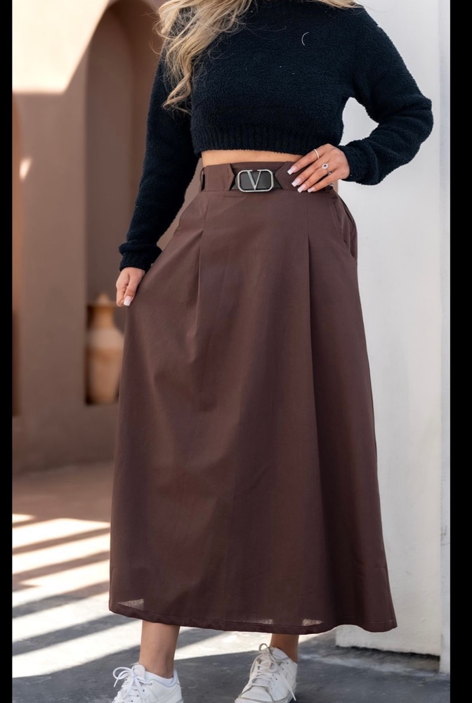 دامن کمر چرم رنگ قهوه ای جنس لینن درجه یک فری سایز
