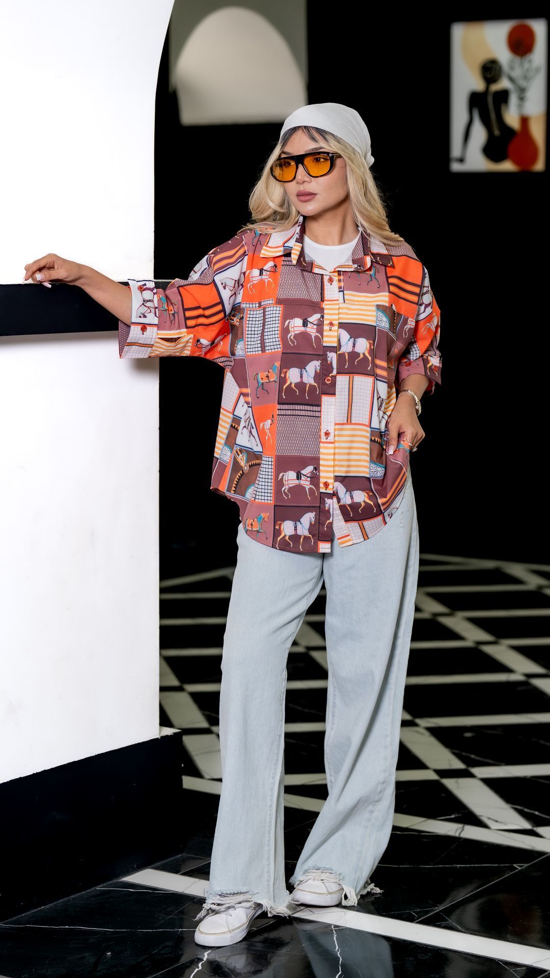 شومیز باکسی رنگ گلبه ای جنس حریر طرحدار خارجی فری سایز مناسب ۳۸تا ۴۶