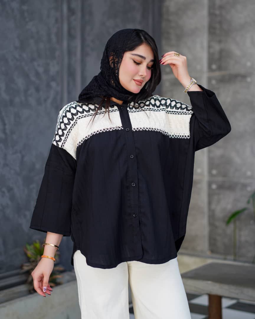 شومیز باکسی رنگ مشکی جنس حریر طرحدار خارجی فری سایز مناسب ۳۸تا ۴۶