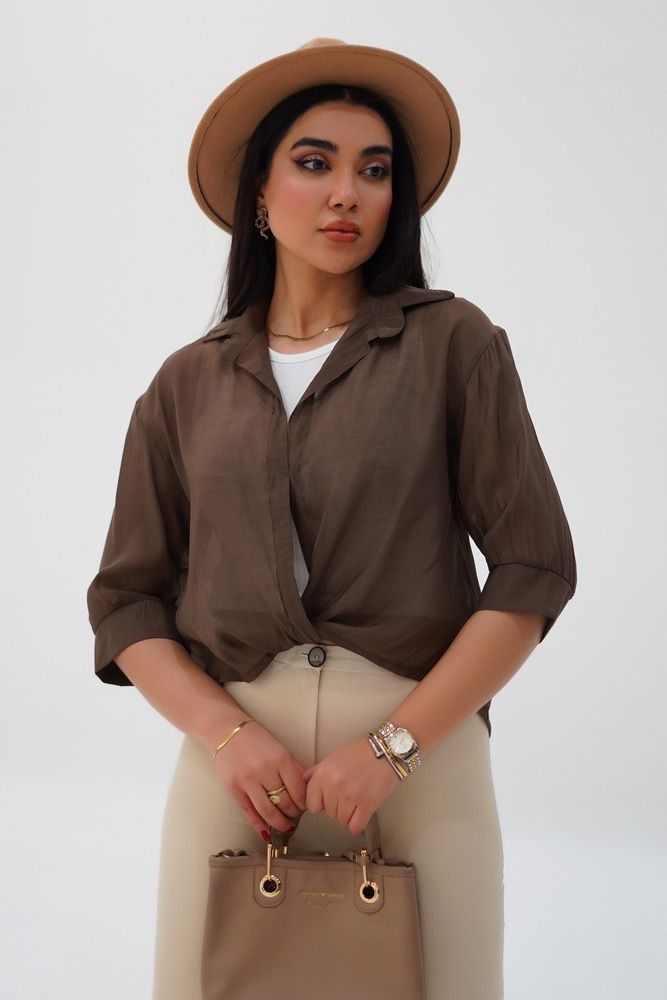 شومیز دو تیکه با تاپ جنس حریر مجلسی ترک فری سایز مناسب ۳۸تا۴۶ رنگ قهوه ای (موجود در ۷رنگ)
