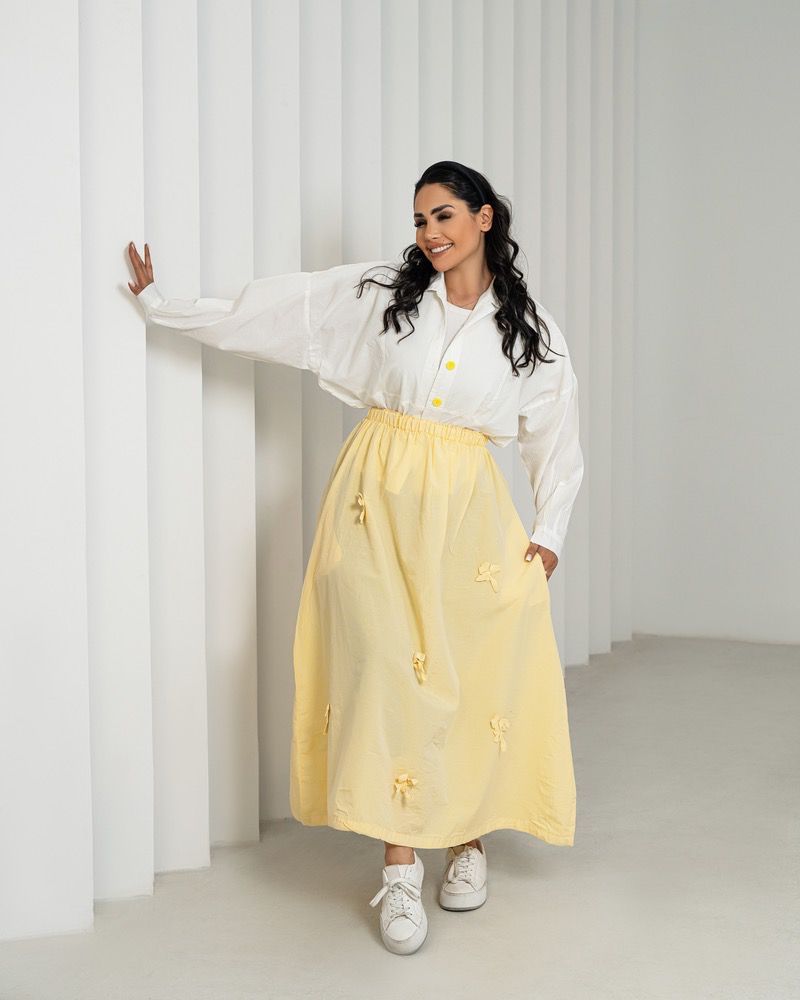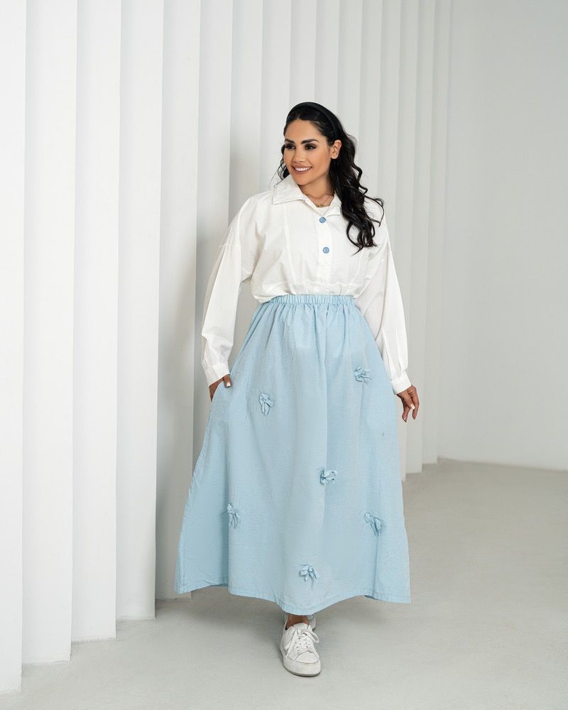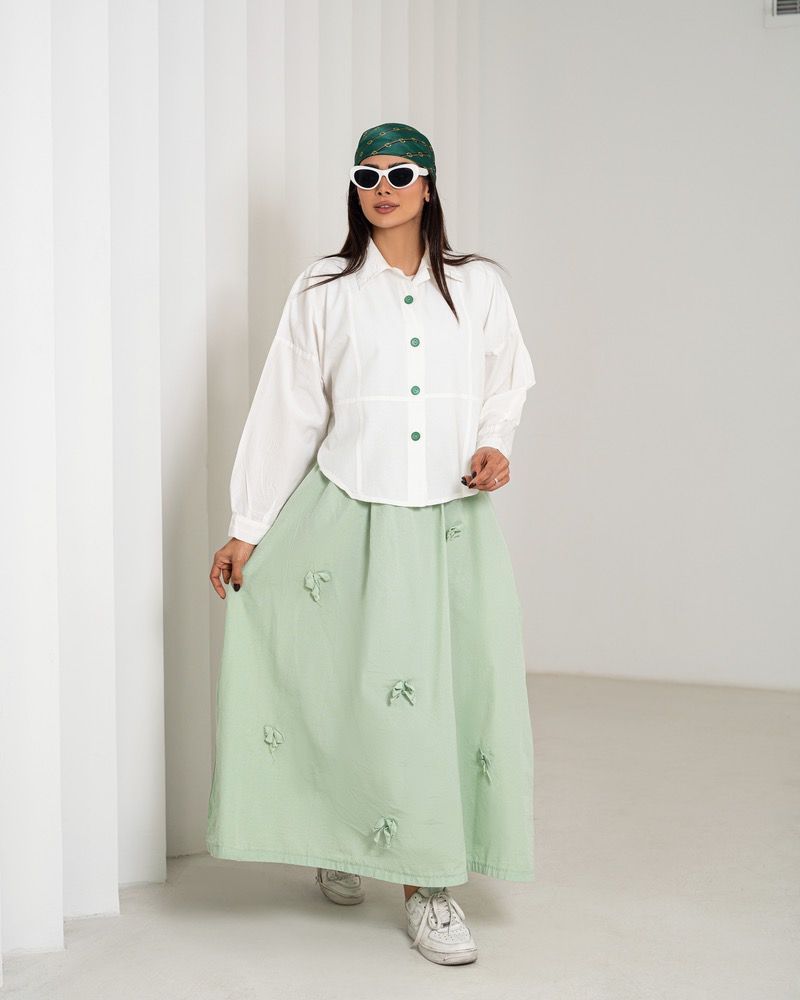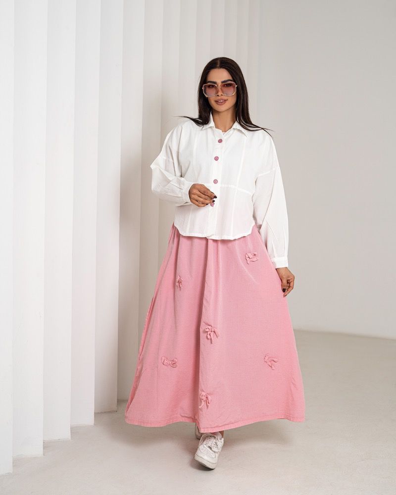 ست شومیز دامن پاپیونی دکمه ست/جنس لینن الیاف/فری سایز مناسب ۳۶تا۴۴ (رنگبندی در ۱۰رنگ زیبا)رنگ بندی داخل سایت هست