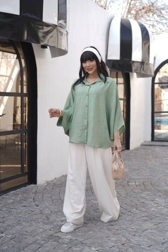 شومیز کیمونو جنس شانتون صوفیا فری سایز مناسب (۳۸تا۴۸)رنگ سبز پسته ای. رنگبندی(در ۶رنگ)داخل سایت